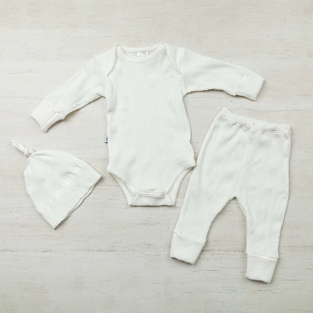 Ajuar de ALGODÓN DESAGUJADO. Body americano, pantalón con puño que se transforma en ranita. Gorro con nudo. Todo recorrido con picot. Bordado logo