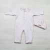 Ajuar de ALGODÓN PIMA ESTAMPADO. Enterito con cartera en delantero. Botones, más gorro. Bordado logo. Recorrido con picot