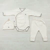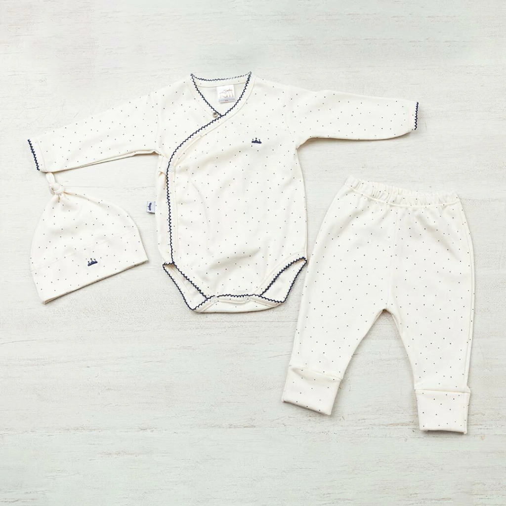 Ajuar de ALGODÓN PIMA PUNTILLE. Body cruzado con gorrito y pantalon todo recorrido con picot y bordado logo