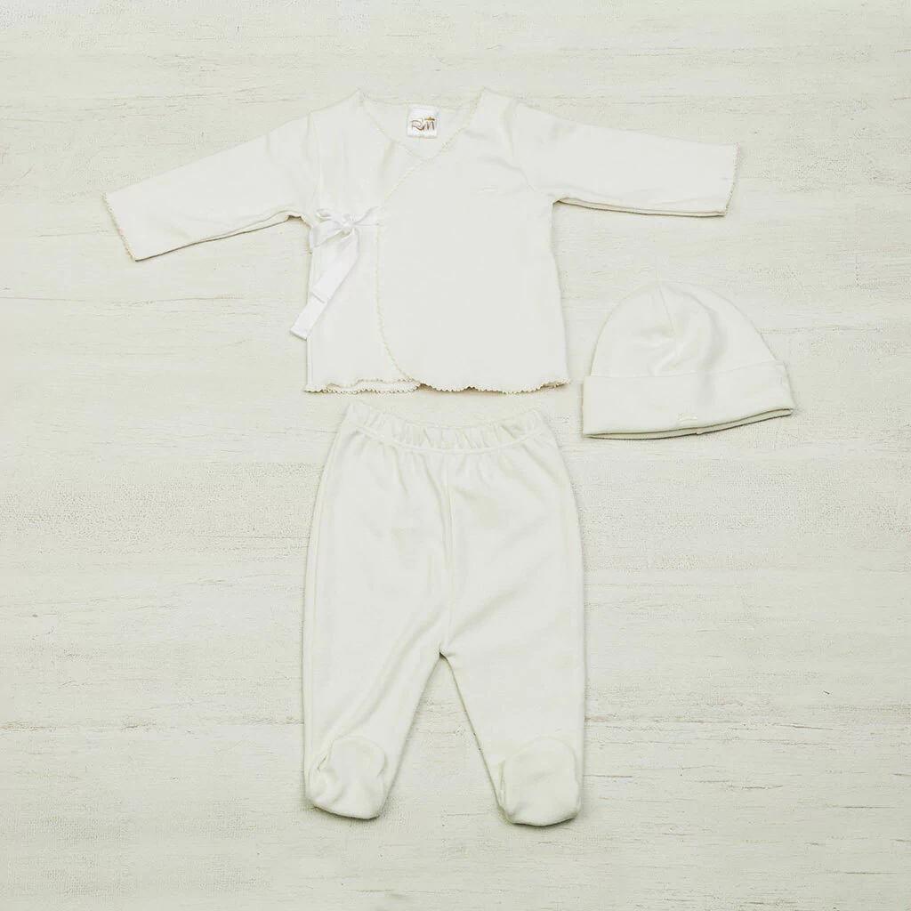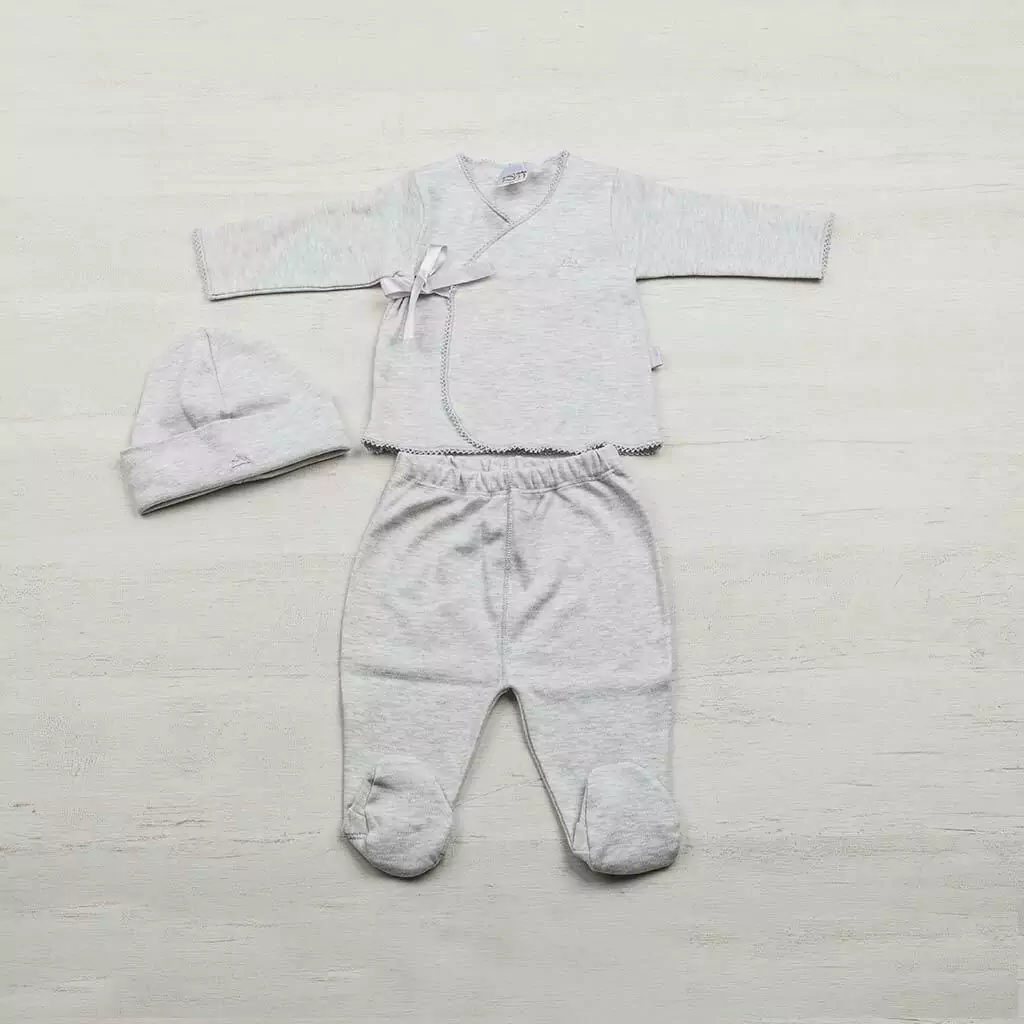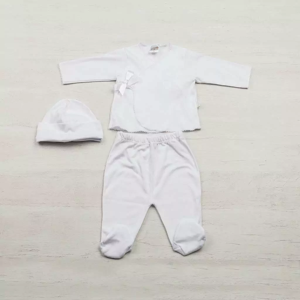Conjunto de algodón Pima liso. Batita cruzada en delantero, atada en costado con cinta al tono. Ranita y Gorro.
