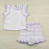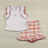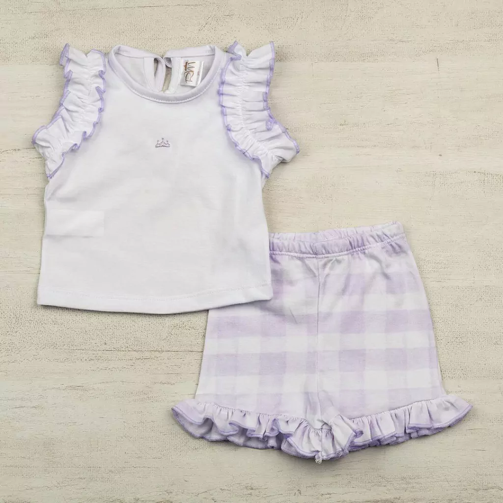 Conjunto de Remera lisa sin mangas con volados bien fruncidos en manga, Terminados con rulote en contraste. Y short de jersey cuadrito, con volado en piernas. Bordado logo