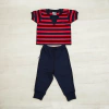 Conjunto de JERESEY RAYADO TEJIDO en compose con liso. Remerita cuerpo rayado, manga corta y cuello con puños en contraste, cartera en hombro. Pantalón largo con recorte en la cola y elástico en puño. Bordado logo