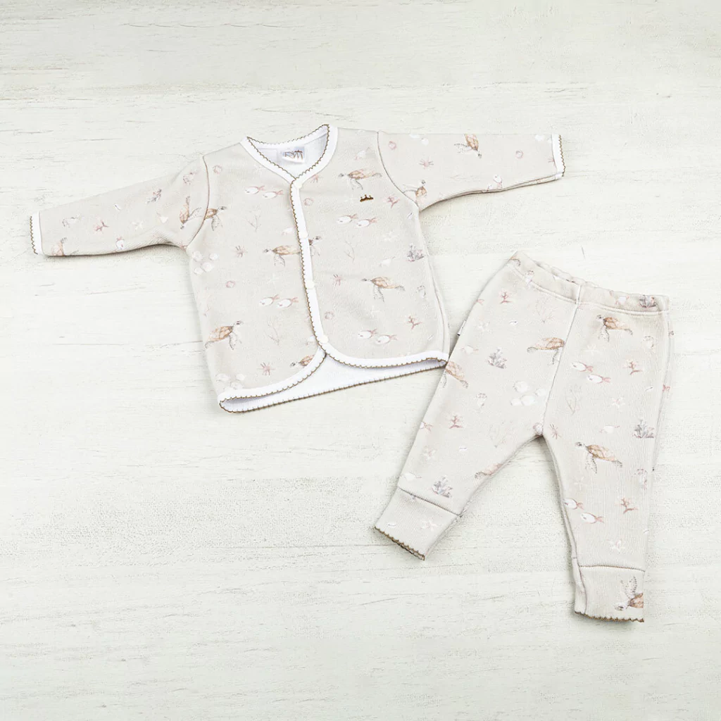 Conjunto de algodón crochet. Saquito prendido con broche cápsula. Pantaloncito. Bordado logo. Recorrido con picot.