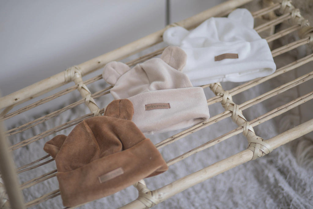 Gorritos con orejas plush. Telas varias. Bordado logo