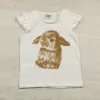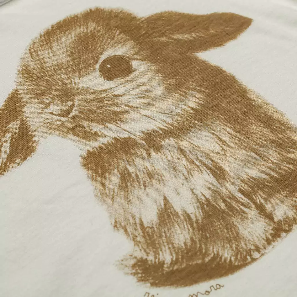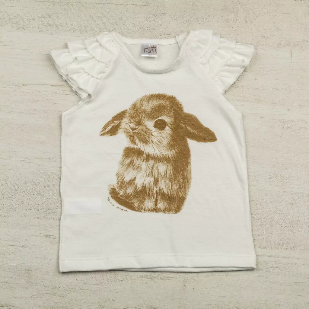 Remera de jersey liso. Manga ranglan con varios volados. Estampa conejito.