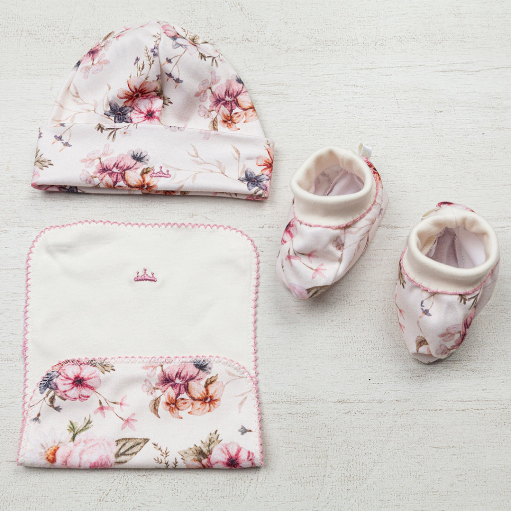 Set de gorro, batita y pantufla de algón pima.